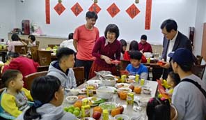 | 除夕團圓日,每年的除夕及大年初一,義光離院的院友們都會攜家帶眷返院團聚,大夥一起圍爐享用豐盛的年菜,閒話家常,好不熱鬧,席間胡董事長大興先生也發給每位師生一個紅包,祝福大家新年快樂。 |